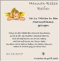 Hannahs Ein und Alles war seit Anfang November 2006 "IHR" Kindegarten. Sie knüpfte binnen weniger Tage so enge Freundschaften, dass die Erinnerungen an Hannah heute noch aktuell sind und die Kinder viel von ihr erzählen. Alle Kinder aus Hannahs Spielegruppe haben ihr zur Beerdigung einen Stern gebastelt. Mögen die vielen Sterne sie begleiten und ihr ewig leuchten.
